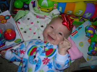 Annie has been rolling over and playing actively on the floor the past week or so. It's so cool that she is practically mobile now! I have to keep an eye on her, she rolls and rolls and rolls into things, like the couch and entertainment center. She also wants to reach out and touch/grab everything! Including the food or glass that I'm drinking from.